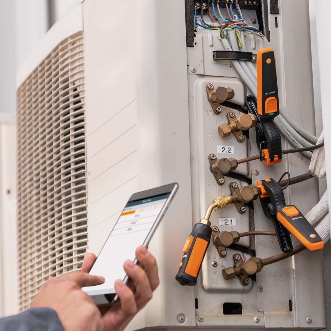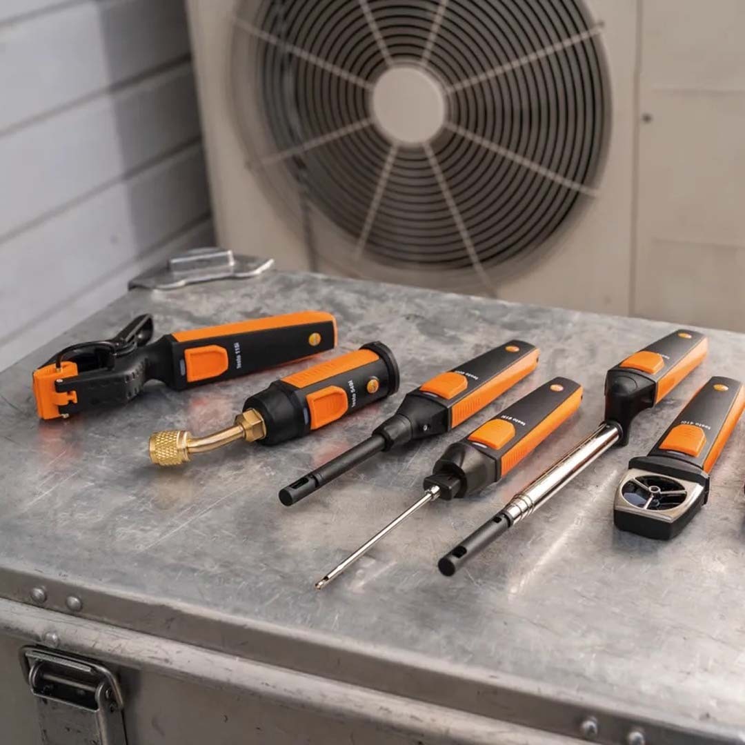 Комплект двох манометрів високого тиску, двох термометрів для труб, двох термогігрометрів, термометра, пірометра, крильчатого анемометра, термоанемометра та дифманометра для обслуговування, налаштування та контролю роботи систем ОВК, кондиціонерів та холодильної техніки, виміряні дані передаються по Bluetooth на смартфон