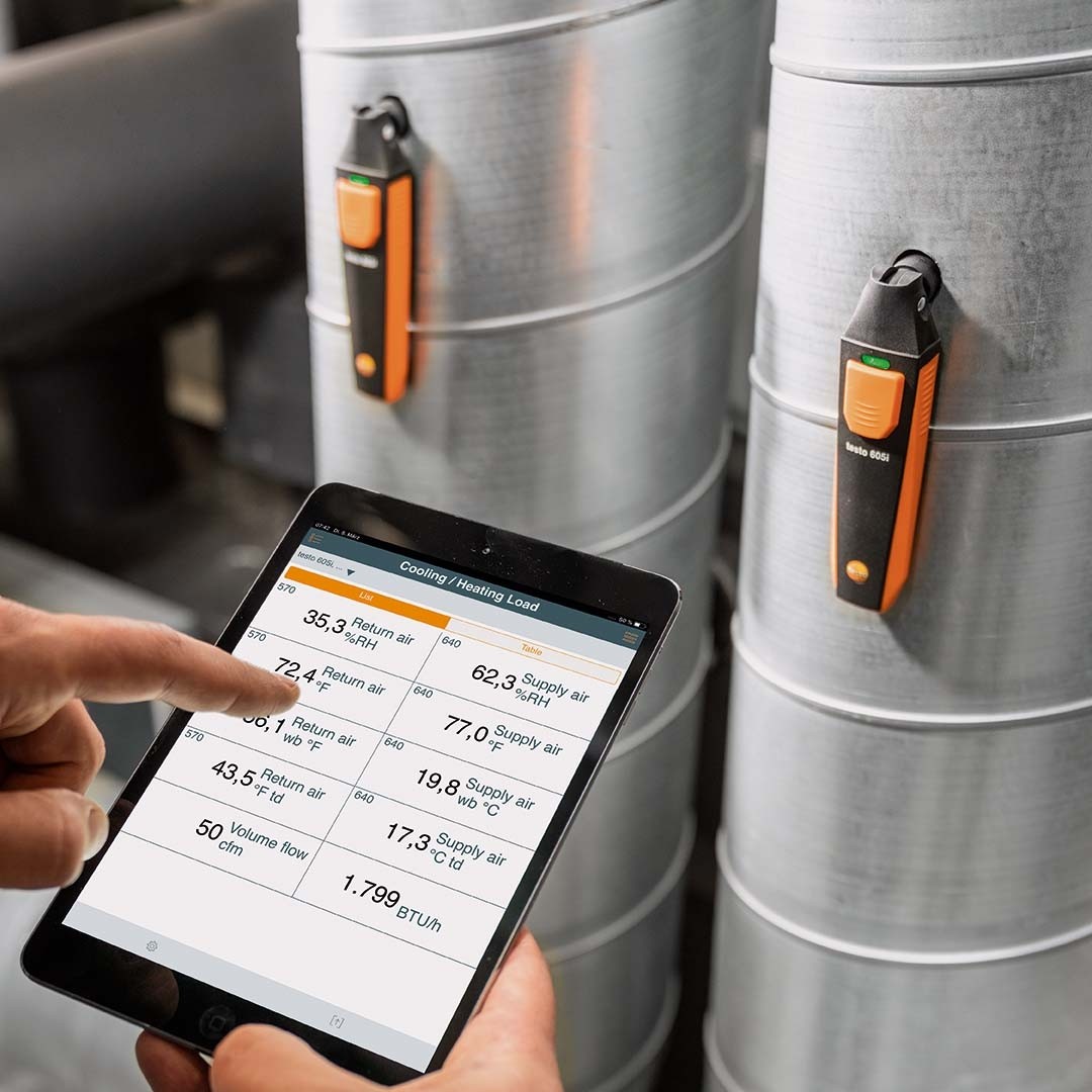 Застосунок testo Smart надасть вам цілий ряд можливостей для ще більш ефективної роботи: автоматичний розрахунок численних параметрів, таких як перегрівання та переохолодження, цільовий перегрів, потужність охолодження та нагріву, різниця температур та візуальне виділення місць з ризиком виникнення цвілі.