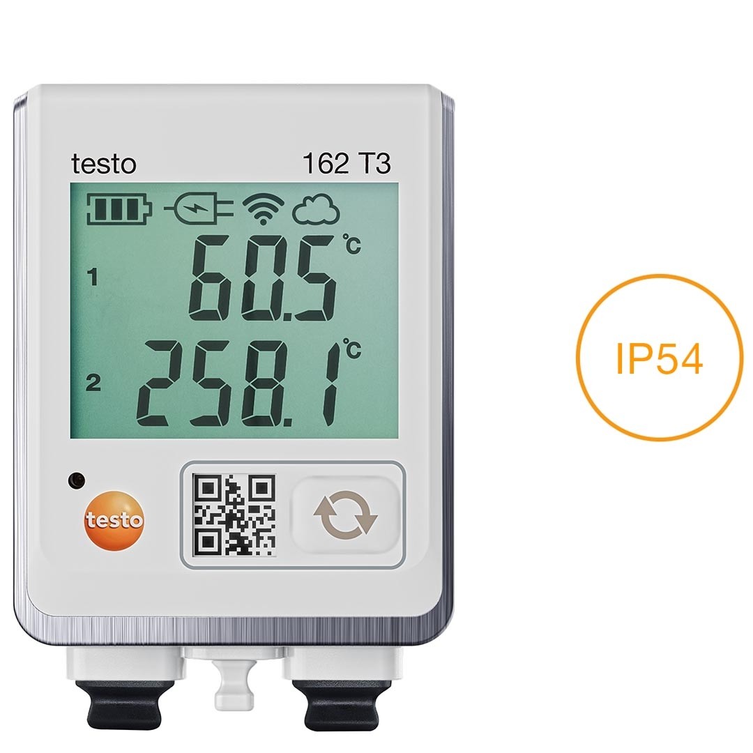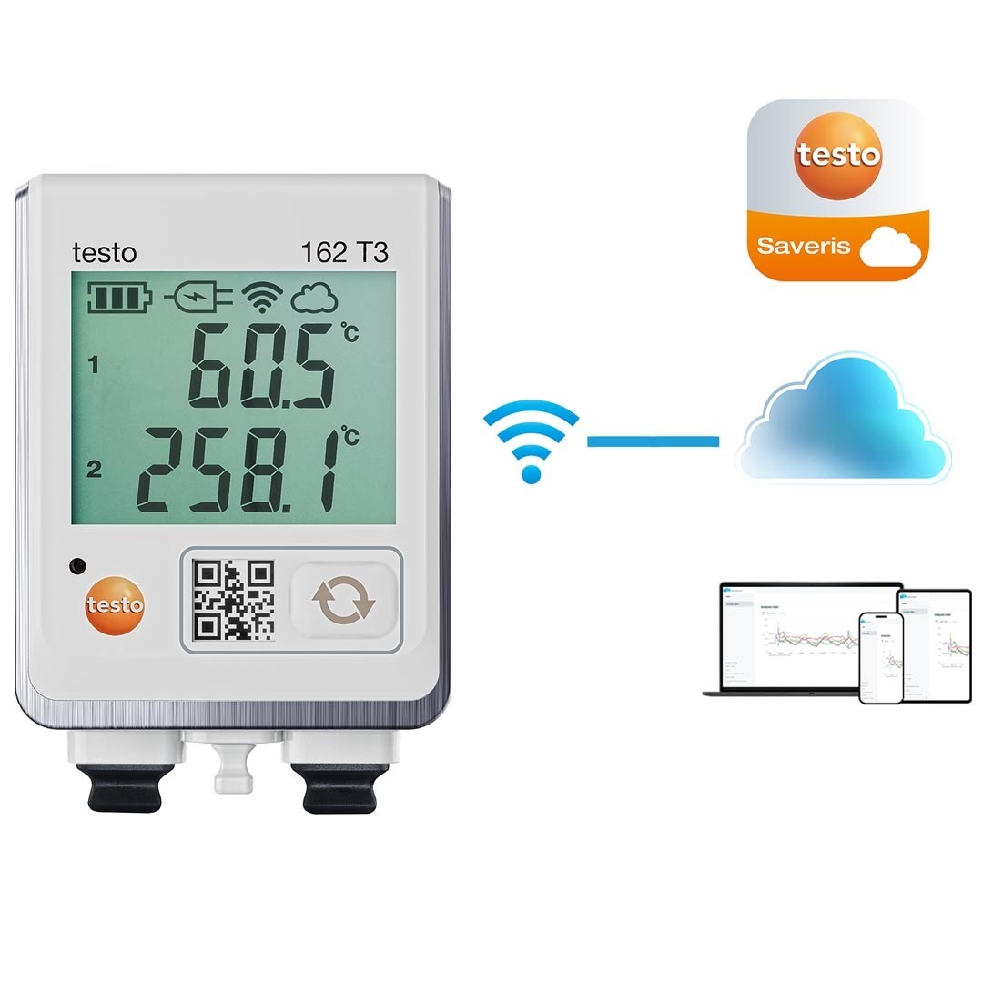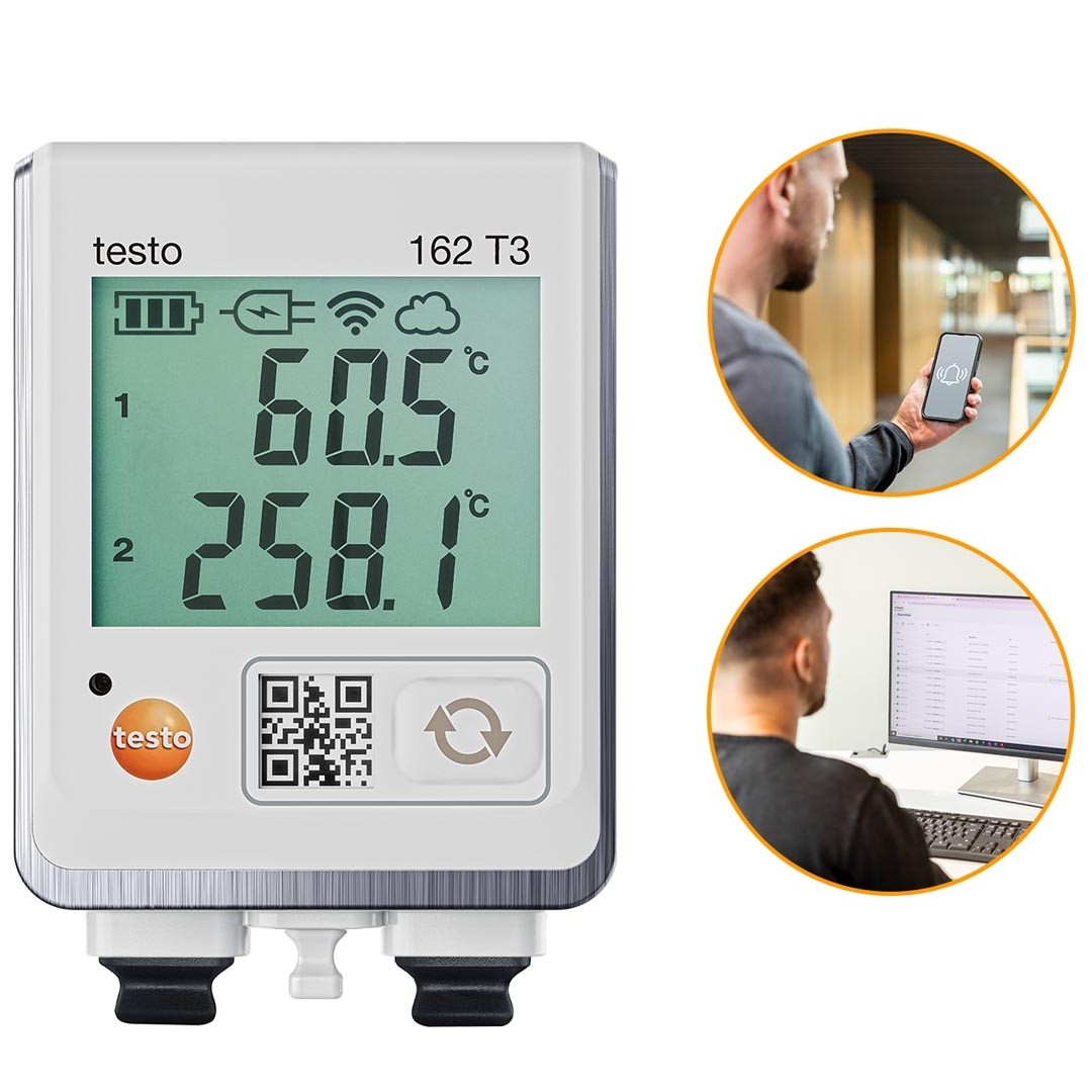 WiFi логер, реєстратор температури testo 162 T3 для печей, морозильного холодильного обладнання, сушильних кімнат, складів, серверних, із зберіганням даних на хмарному сховищі, автоматичною відправкою повідомлень при перевищенні граничних значень або низькому заряді батарейок, можливістю підключення двох зондів температури в діапазоні -200 ... +1000 °C. Для програмування логерів та зчитування виміряних даних необхідно придбати ліцензію на щорічне використання хмарного сервісу.