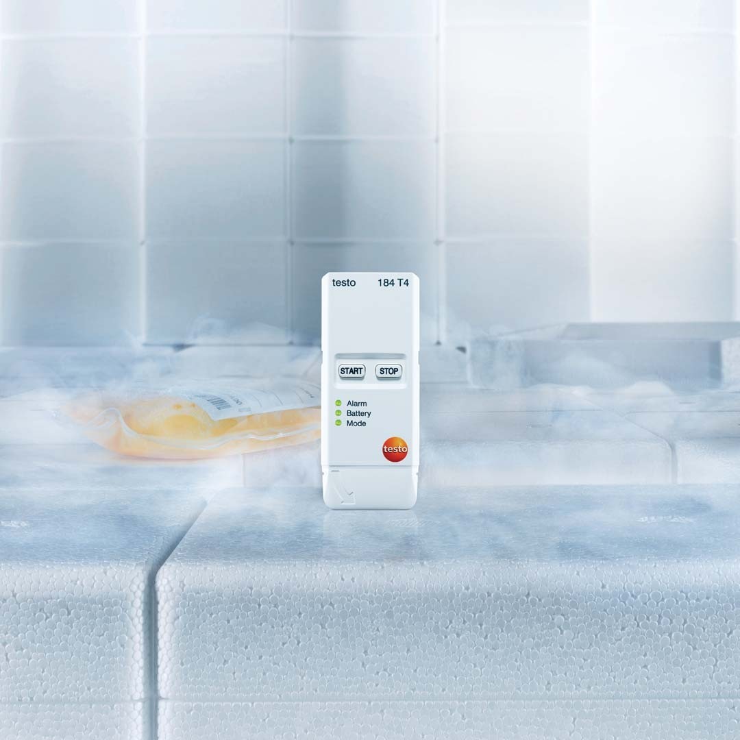 Компактний логер, реєстратор температури testo 184 T4 для транспортування ліків, вакцин, плазми крові та біологічних матеріалів при температурах до -80 оС, з візуальною сигналізацією, пам'яттю на 40 000 значень, обміном даних зі смартфоном по NFC, розрахунком середньої кінетичної температури, підключенням до комп'ютера безпосередньо без необхідності в ПЗ, автоматичним створенням звітів