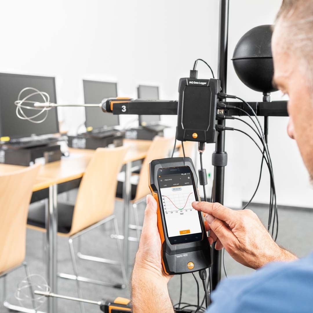 Для одночасного проведення професійних вимірювань у декількох місцях разом з анемометром testo 400 ви зможете замовити спеціальний реєстратор даних (IAQ). IAQ реєстратор діє незалежно від основного приладу і здатен вимірювати параметри і записувати їх у внутрішню пам'ять протягом двох тижнів. Програмування і зчитування даних з реєстратора відбувається за допомогою портативного анемометра testo 400.