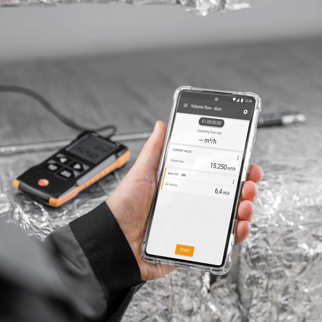 Ручний анемометр testo 416 оснащений Bluetooth і має можливість передавати виміряні дані на смартфон або планшет, зі встановленим Застосунком testo Smart. Застосунок testo Smart безкоштовний для завантаження і підходить для мобільних пристроїв з операційними системами Android або iOS. Функції анемометру для вентиляції чудово доповнюються Застосунком, завдяки якому ви зможете переглянути виміряні значення у вигляді списку, таблиці або графіка, зберегти їх та створити цифрові звіти по результатам вимірювань. Застосунок не тільки допоможе індивідуально налаштувати крильчатий анемометр, а й перетворить ваш смартфон на другий дисплей приладу.