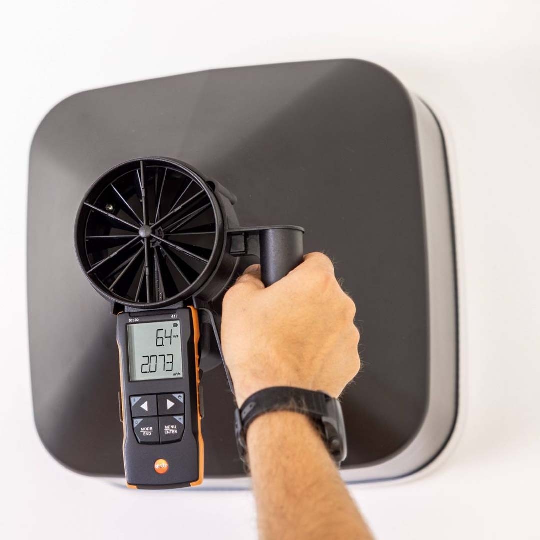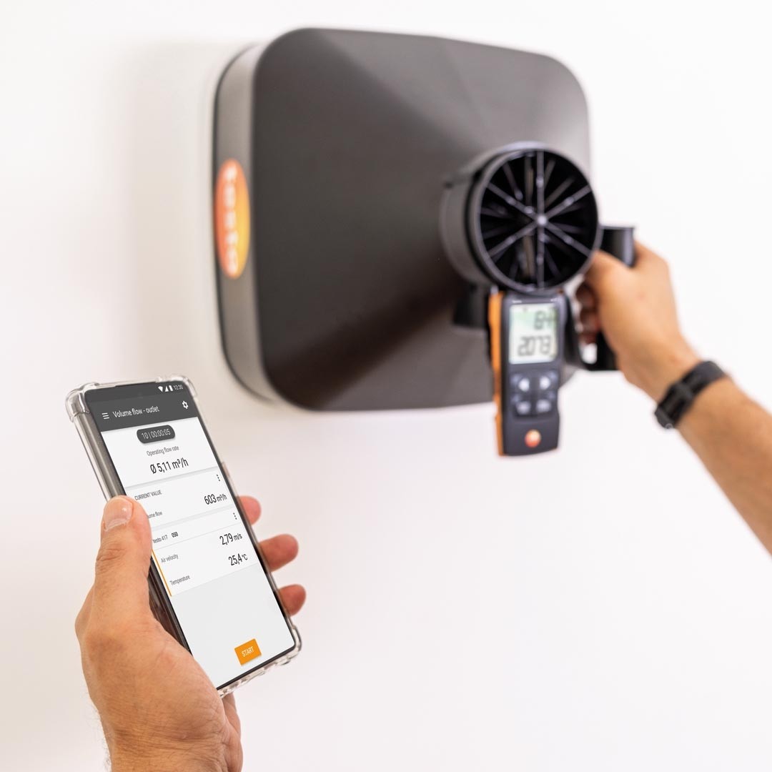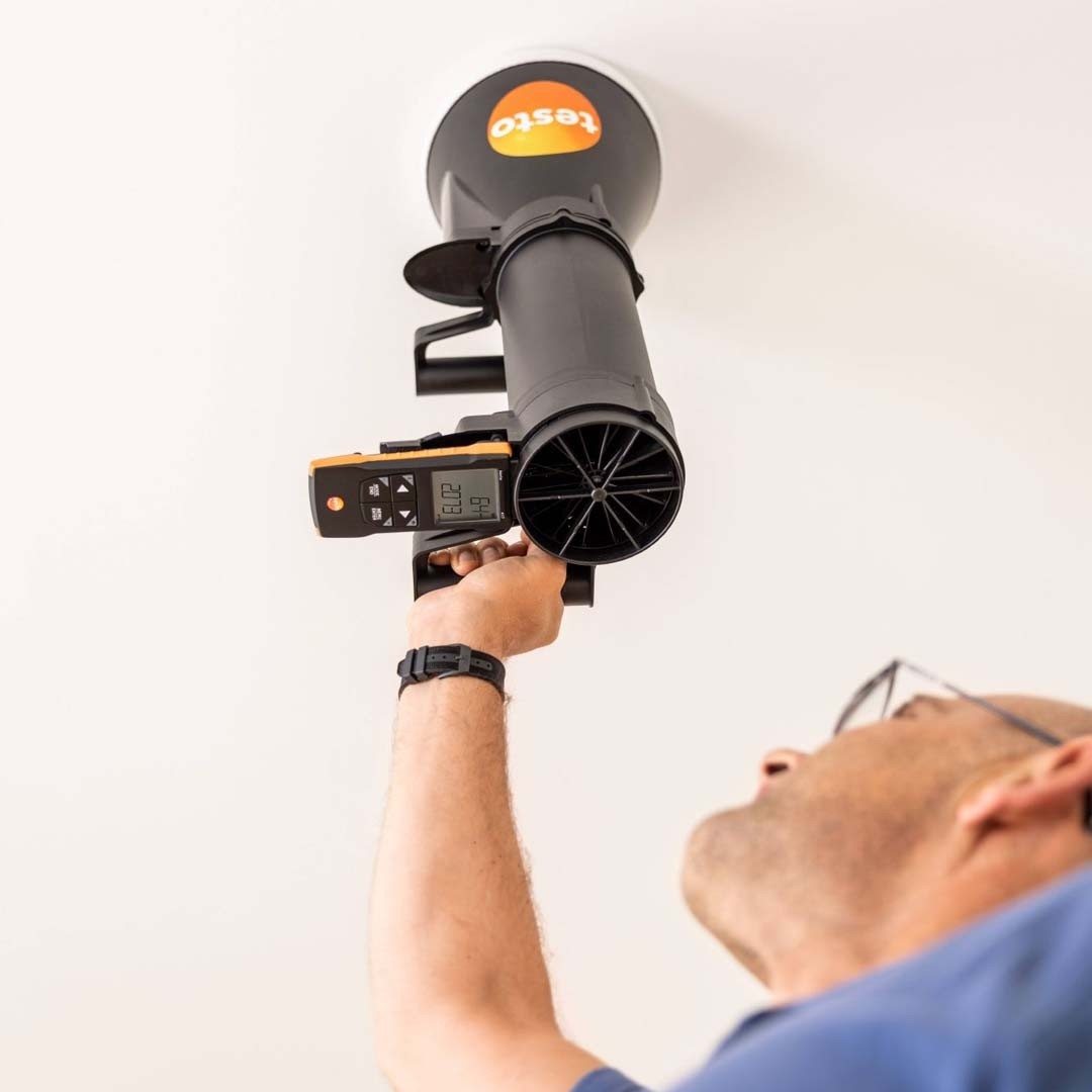 Анемометр testo 417 з крильчаткою 100 мм, двома воронками та випрямлячем потоку для високоточного вимірювання швидкості та об'ємної витрати на вихрових дифузорах, з розрахунком середнього значення за часом і кількістю вимірювань, передачею даних на смартфон