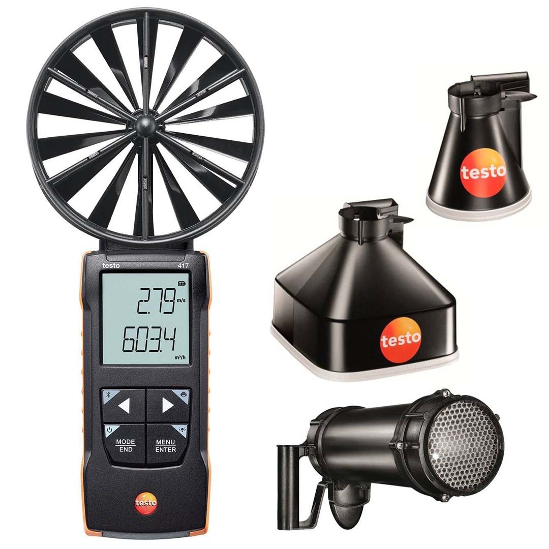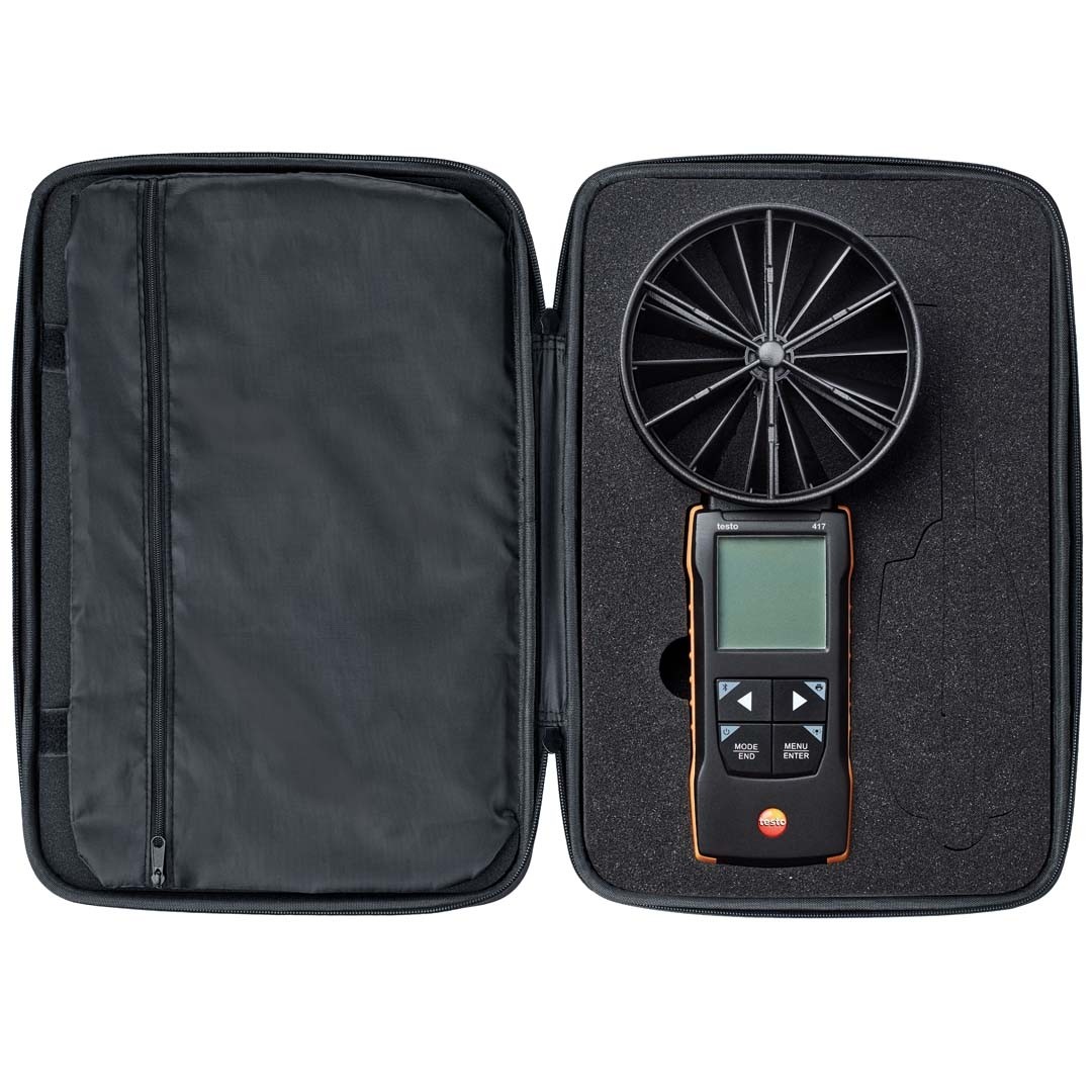 Анемометр testo 417 з крильчаткою 100 мм, кейс для приладу, набір воронок (кругла Ø 200 мм та квадратна 330 х 330 мм), сумка для транспортування воронок, випрямляч потоку, батарейки, заводський протокол калібрування