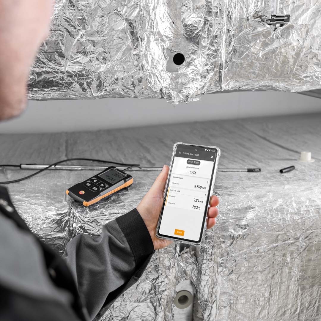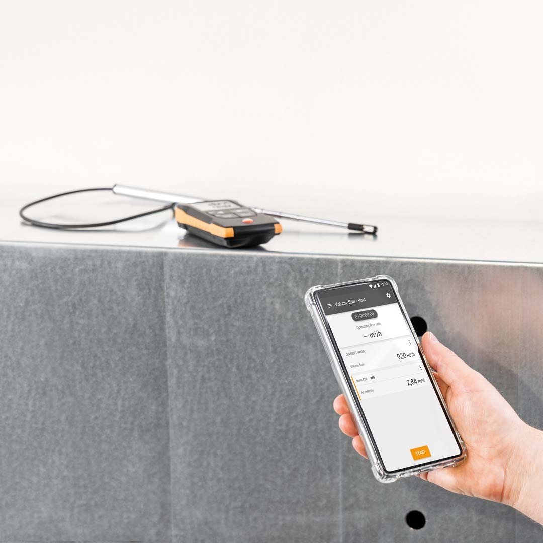 Ручний анемометр testo 425 оснащений Bluetooth і має можливість передавати виміряні дані на смартфон або планшет, зі встановленим Застосунком testo Smart. Застосунок testo Smart безкоштовний для завантаження і підходить для мобільних пристроїв з операційними системами Android або iOS. Функції анемометра для вентиляції чудово доповнюються Застосунком, завдяки якому ви зможете переглянути виміряні значення у вигляді списку таблиці або графіка, зберегти їх та створити цифрові звіти по результатам вимірювань. Застосунок не тільки допоможе індивідуально налаштувати анемометр з обігріваємою струною, а й перетворить ваш смартфон на другий дисплей приладу.