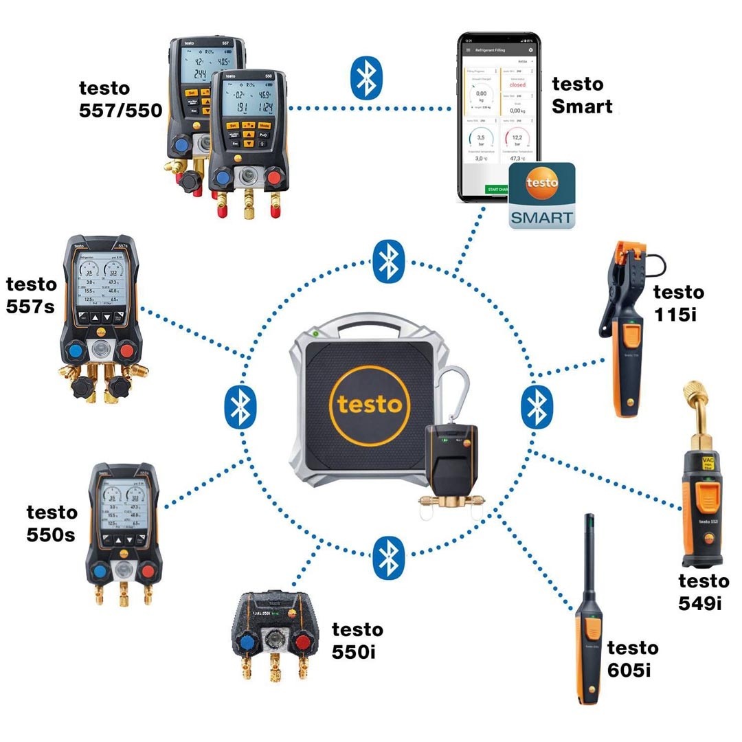 Бездротові ваги автоматично підключаються по Bluetooth до манометричного колектора та Застосунку, встановленого на вашому смартфоні або планшеті. Завдяки цьому ваги для заправки кондиціонера зручні та гнучкі у роботі, навіть у обмеженому просторі. Ваги для фреону підключаються автоматично по Bluetooth до манометричних колекторів testo 557s, testo 550s, testo 550i, testo 557, testo 550, які у свою чергу, обмінюються даними зі Смарт зондами: термометром температури труб testo 115i, манометром високого тиску testo 549i та термогігрометром testo 605i. Завдяки компактному та міцному корпусу, малій вазі та практичній ручці для перенесення, ваги є дуже зручними у щоденному використанні.