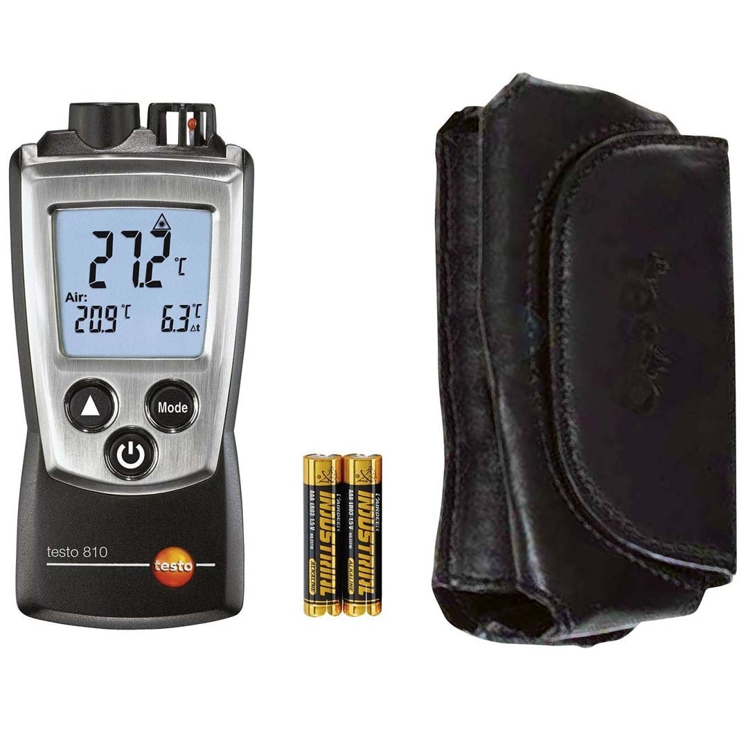 У комплект поставки ІЧ пірометра testo 810 входить шкіряний чохол із затискачем для кріплення на поясі, кришка для захисту дисплея, батарейки та заводський протокол калібрування.