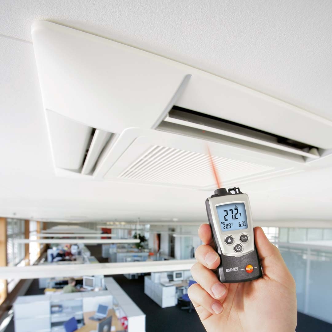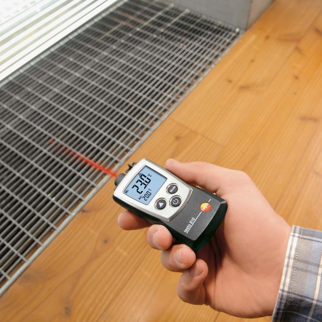 Інфрачервоний термометр testo 810 ідеально підходить для контролю роботи систем опалення, вентиляції та кондиціювання повітря. По одному натисканню кнопки ви зможете виміряти температуру поверхні радіаторів, вентиляційних отворів або вікон та порівняти її з температурою повітря. Одночасне вимірювання температури батарей та навколишнього повітря допоможе визначити причину низької температури в приміщенні. Оскільки проблема може бути не в холодних батареях, а, наприклад, у дерев'яних вікнах, через які постійно надходить холодне повітря.