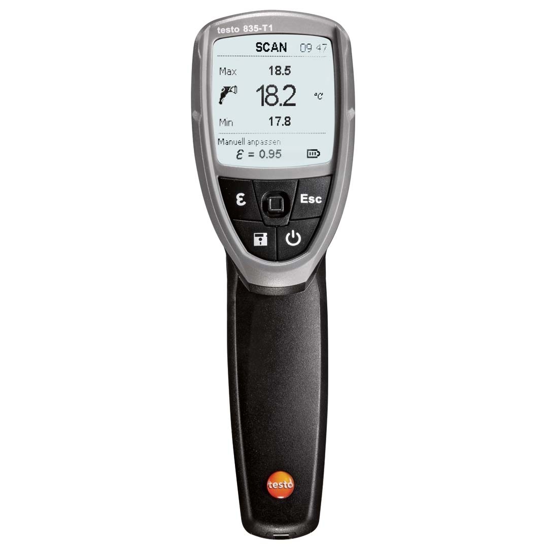 Промисловий пірометр testo 835 Т1 для безконтактного вимірювання температури поверхні, з оптикою 50:1, звуковою та візуальною сигналізацією, 4-точковим лазерним маркером, ПЗ для обробки даних на комп'ютері, вбудованою пам'яттю на 200 значень, можливістю підключення зовнішніх зондів