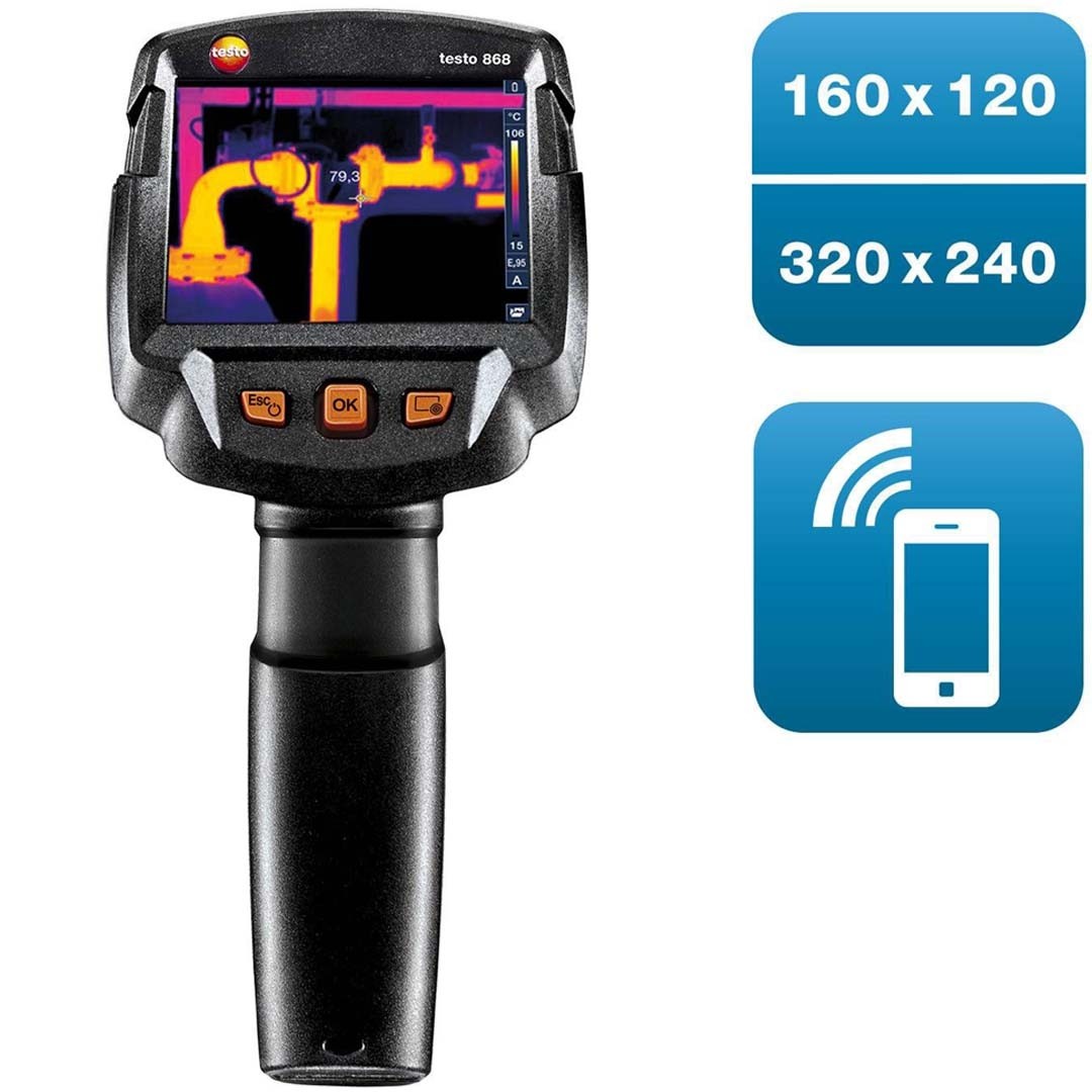 Тепловізор для витоків води оснащений всіма необхідними функціями для інфрачервоної діагностики та енергоаудиту. Основні відмінності тепловізора для будинку testo 868 від базової моделі testo 865, полягають в наявності модуля Bluetooth, розширеного діапазону вимірювань -30 ... 650 °С, а також у кращій термочутливості 0,08 оС.