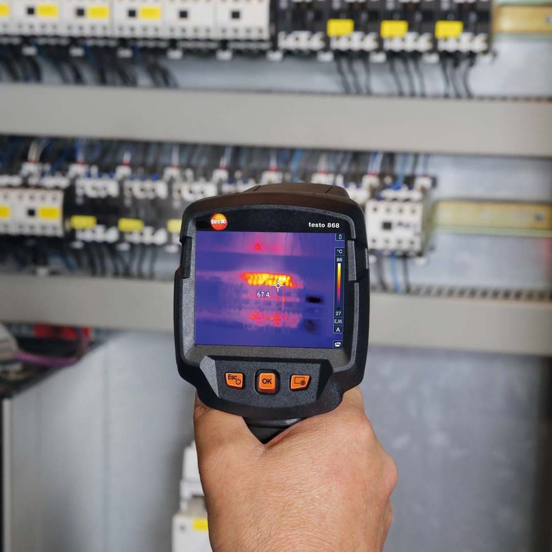 Тепловізори для електрика testo 868 оснащені вбудованим цифровим фотоапаратом, функцією автоматичного розпізнавання найгарячішої і найхолоднішої точок, асистентами відстані та шкали.