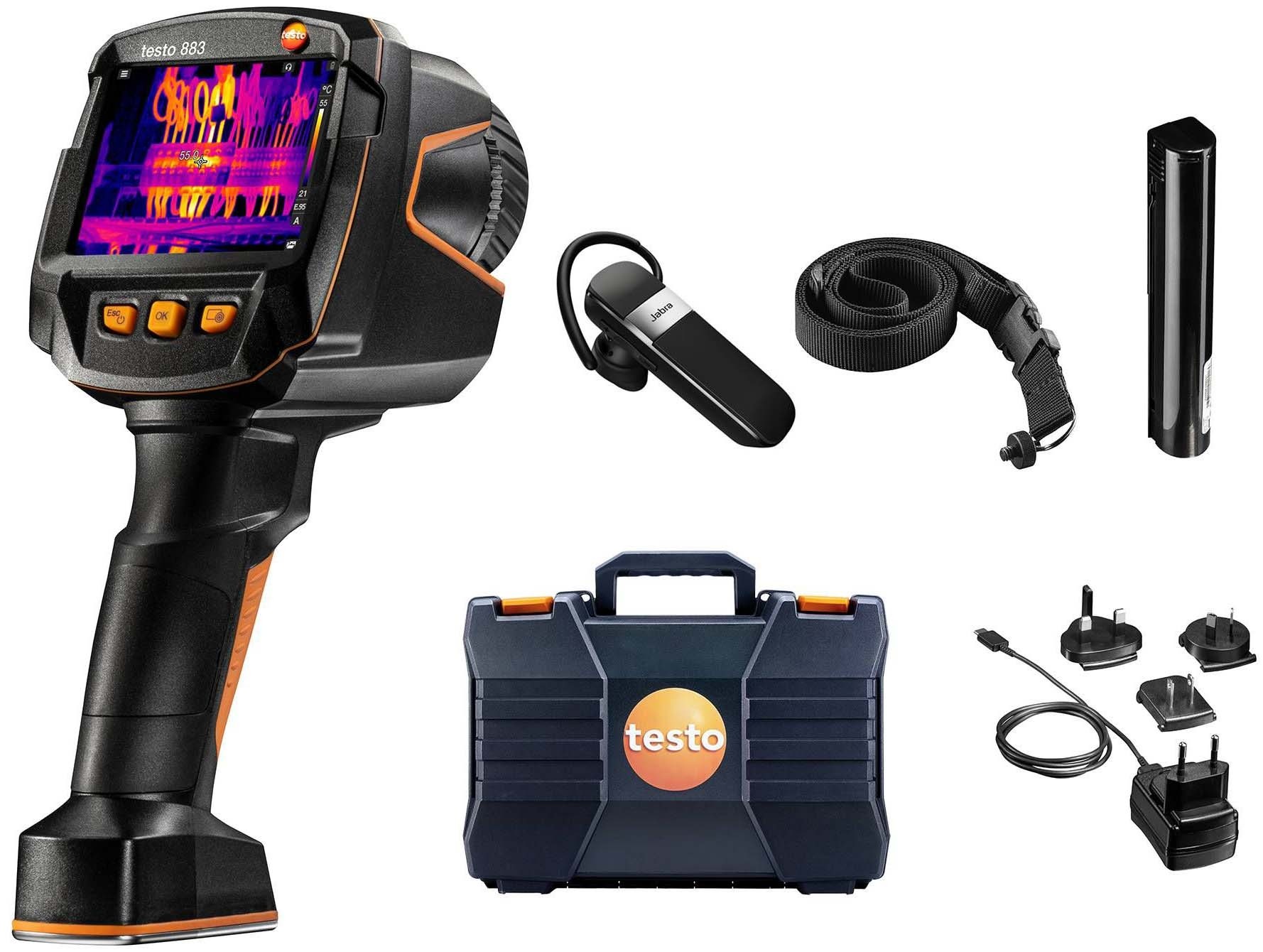 Будівельний тепловізор testo 883 з об’єктивом 42° x 32°, кабелем USB-C, блоком живлення, акумулятором, гарнітурою для голосових коментарів, інструкцією, заводським протоколом калібрування, професійним ПЗ IRSoft та кейсом для транспортування